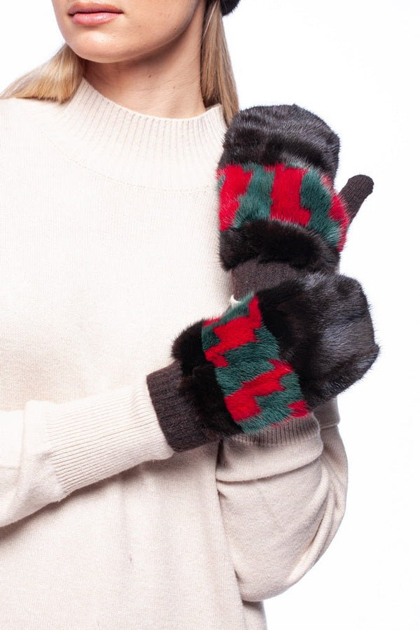 Mitaines boutiques à rabat en fourrure de vison marron foncé avec motifs rouges et verts, gants convertibles, Mitaines à rabat en fourrure de vison marron foncé avec motifs rouges et verts, gants convertibles détaillant